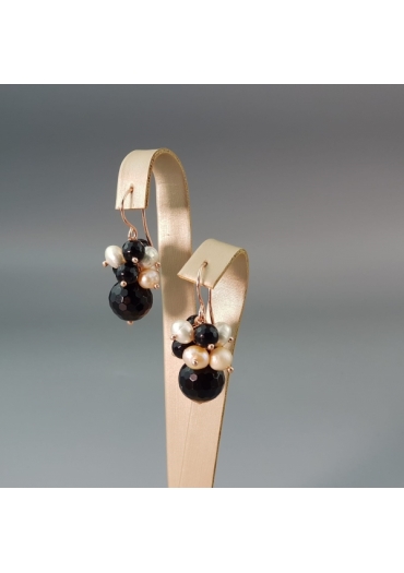 Orecchini a grappolo, quarzo rutilato verde 6 mm e perle coltivate,